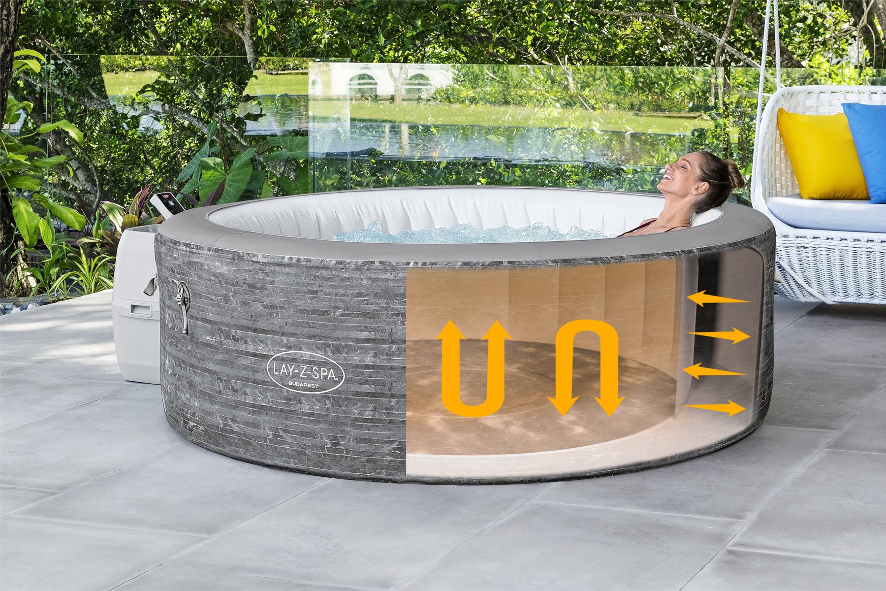 Lay-Z-Spa Budapest har fordeler av en EnergySense™ varmebevarende isolert topp og yttertrekk, noe som resulterer i en 40% forbedring i energieffektivitet sammenlignet med lignende modeller i Lay-Z-Spa-serien.