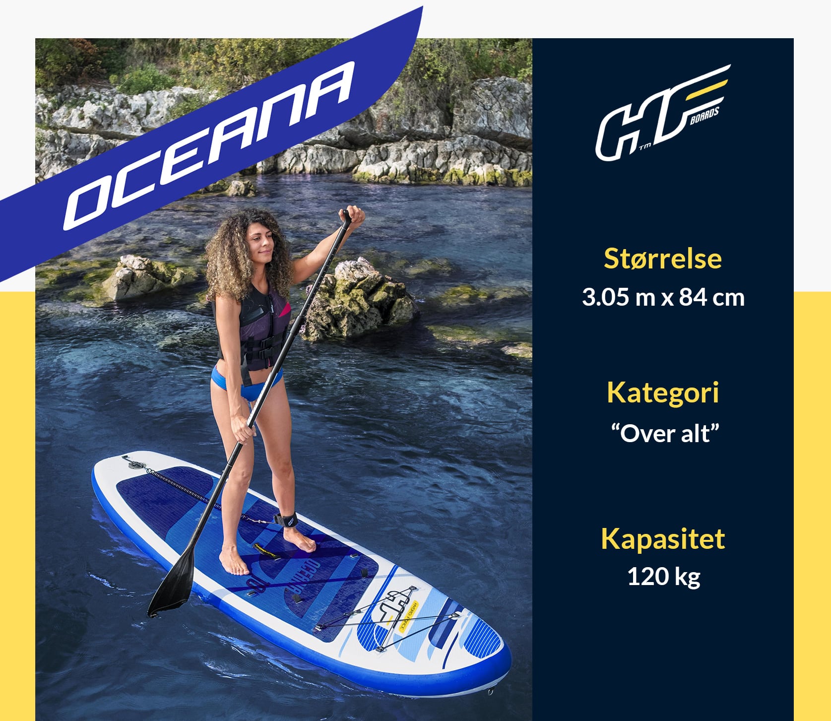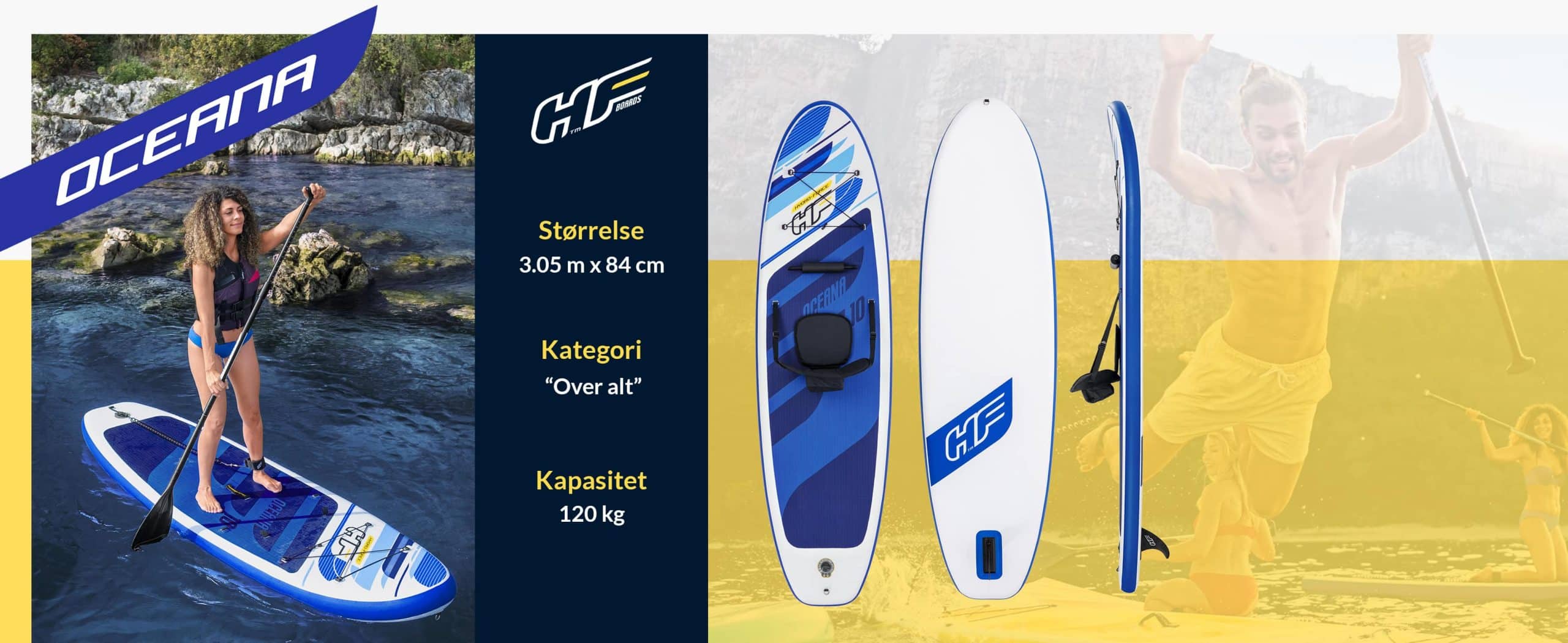 Hydro-Force Oceana er et oppblåsbar SUP-brett med unike funksjoner! Brettet er retningsstabilt, lett å padle og manøvrere. Oceana Paddle Board har en bæreevne på hele 120 kg og lengde på 3,05 meter. “Drop-Stitch” materialet har samme styrke som en brett laget av hardplast.